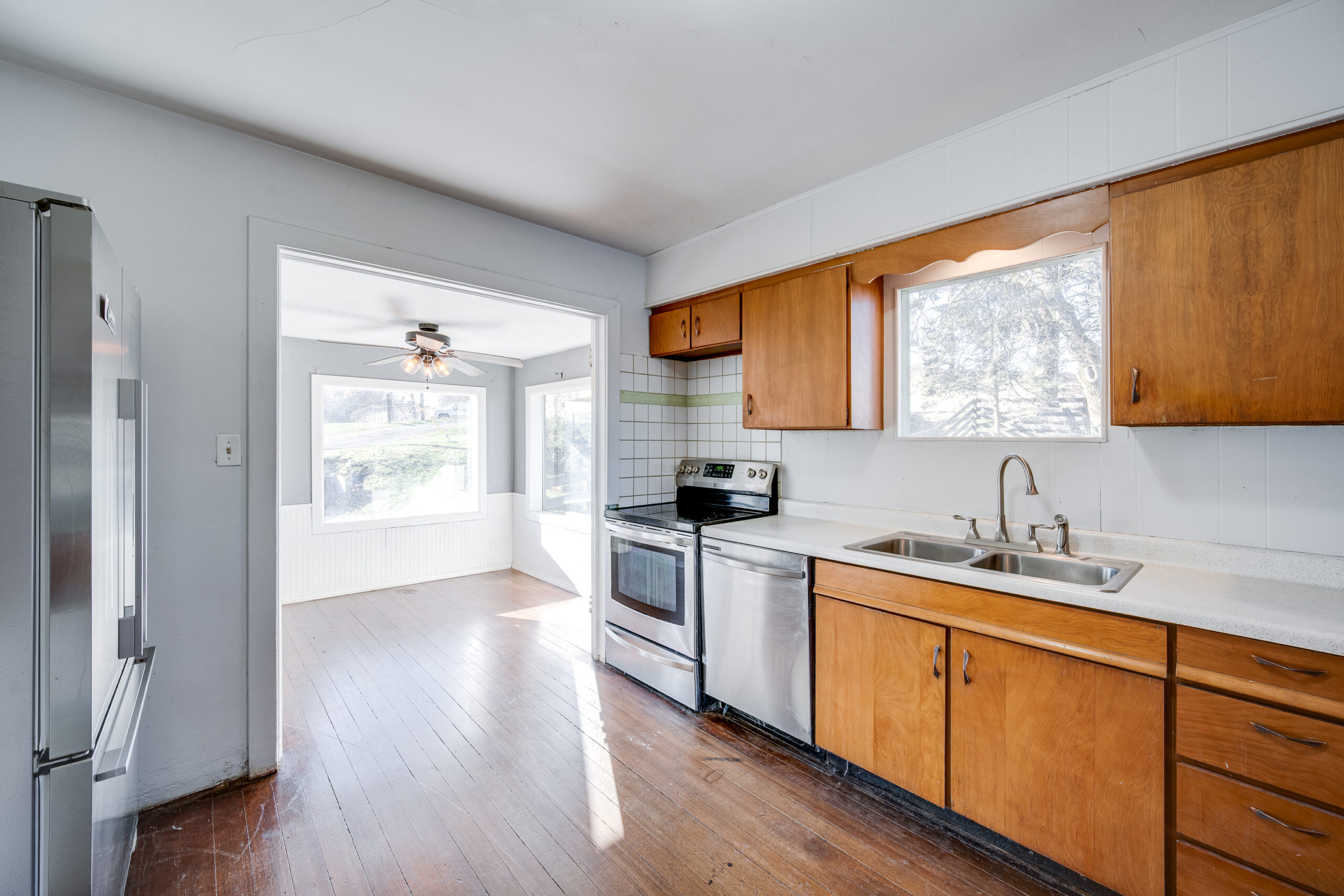 enter the home and a sunny, breakfast nook just off the kitchen with newer appliances. Through the kitchen is an open living/dining