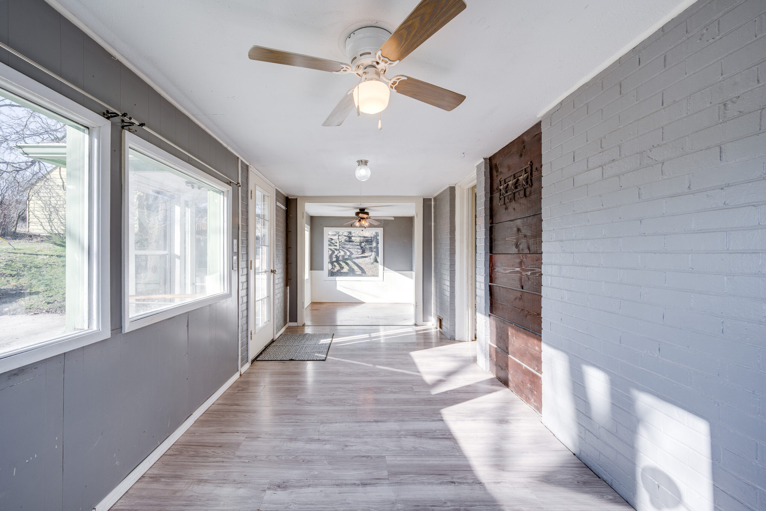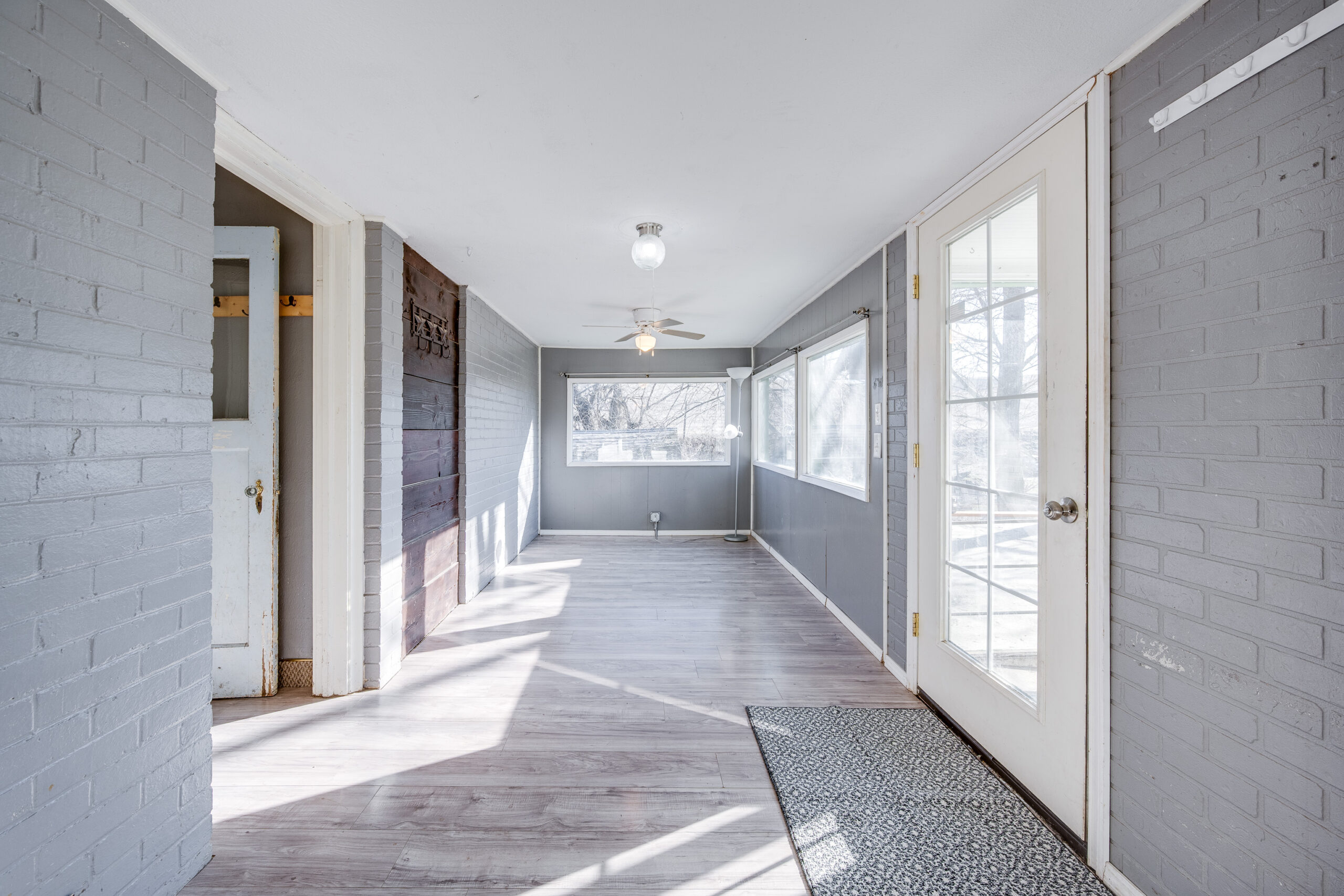the main floor is a brightly-lit sunroom that has been used as both a reading area and office, with new flooring that greets you as you